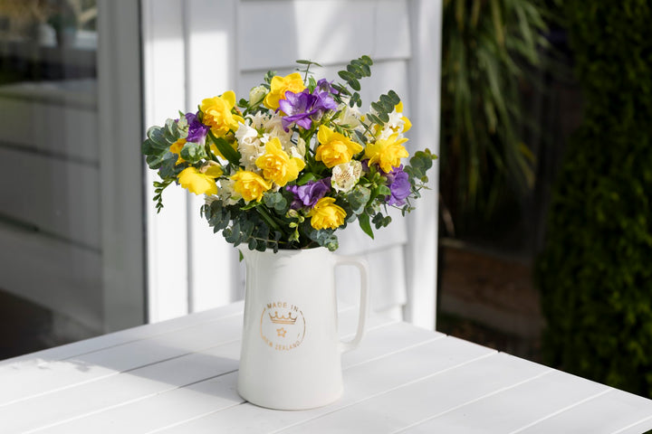 An enchanting mix of Daffodils, Hyacinths, Freesia, Alstroemeria.