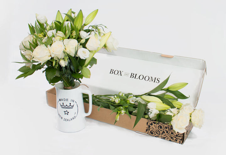 Elegance in every petal, White Florist Blooms by Box and Blooms showcase the purity and grace of white-themed flowers. This stunning arrangement exudes sophistication, perfect for adding a touch of timeless beauty to any setting. Delivered fresh for Auckland flower enthusiasts who appreciate the simplicity and serenity of white floral expressions.